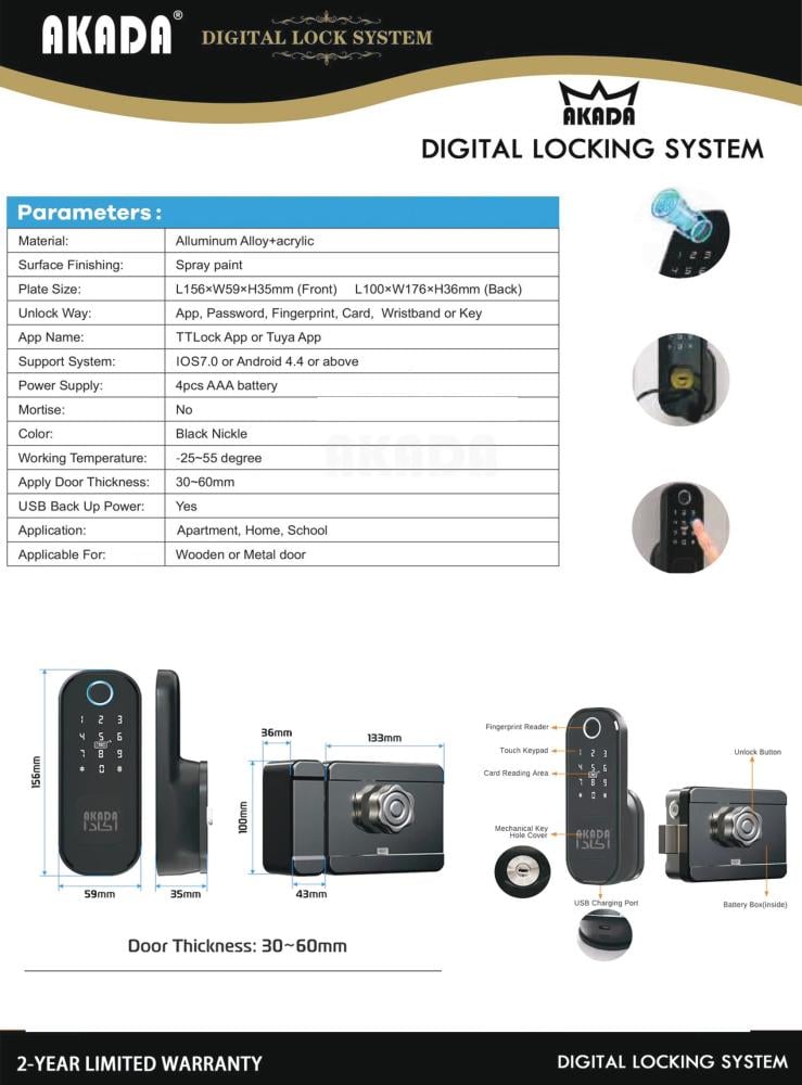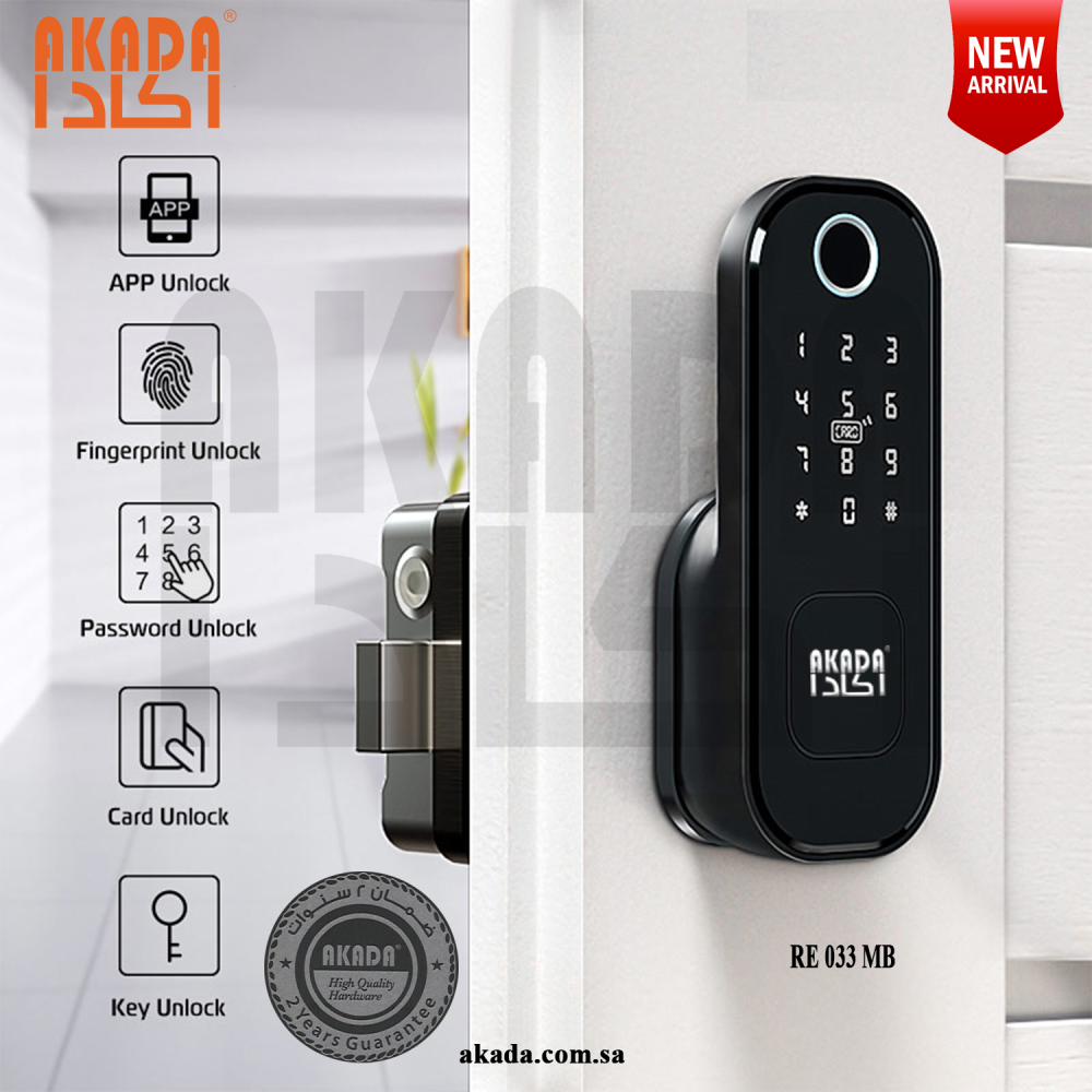 قفل AKADA RE-033 الإلكتروني الذكي مخصص للأبواب الخارجية في الفلل، يتميز بمتانة عالية ومناسب لأبواب الحديد، ومقاوم للعوامل الجوية مثل الشمس والمطر. يعمل بطرق متعددة (بصمة الإصبع، كلمة المرور، البطاقة، التطبيق، المفتاح الميكانيكي)، مع إمكانية التحكم الكامل من خلال تطبيق TTLock، ويدعم منفذ USB للطوارئ، كما يتوافق مع أنظمة الانتركوم لزيادة الأمان والتحكم الذكي.